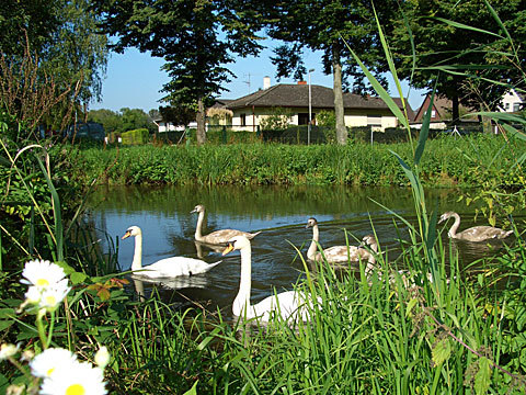 Eine junge Schwanfamilie schwimmt auf der Elz an unserem Gästehaus vorbei
